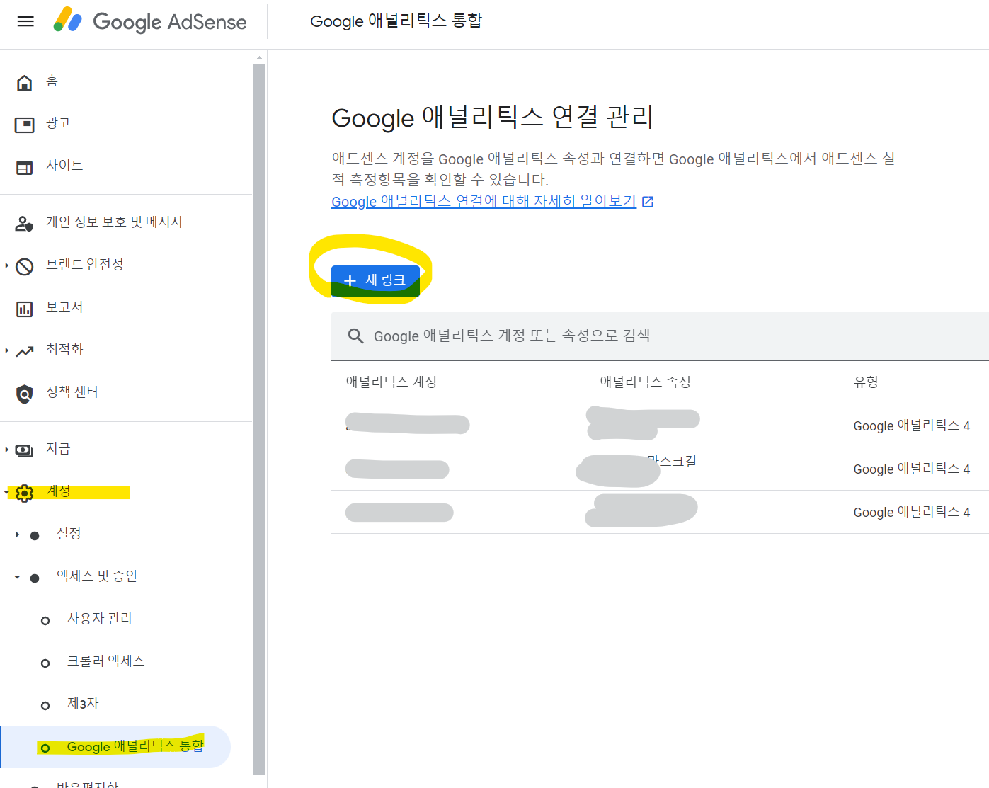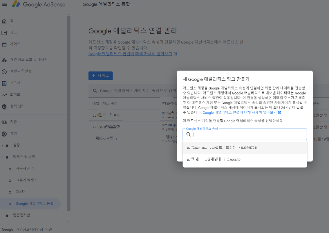 결론 : 애드센스 관리 홈에서 계정> 액세스 및 승인> 구글 애널리틱스 통합