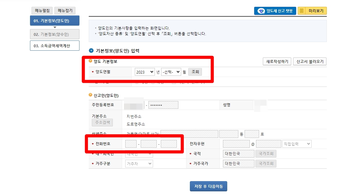 기본정보 양도인과 양수인 입력칸, 소득금액세액계산 화면이 나옵니다.