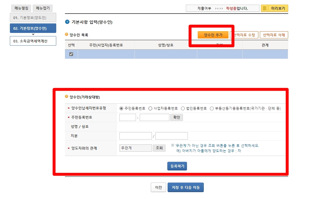 저장 후 다음 이동을 누르시면 양수인 입력화면이 나옵니다.
